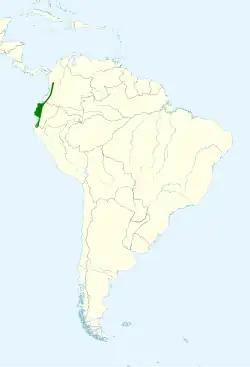 It is found in Colombia, Ecuador, and Peru. Its natural habitats are subtropical or tropical dry forest, subtropical or tropical moist lowland forest, and heavily degraded former forest.