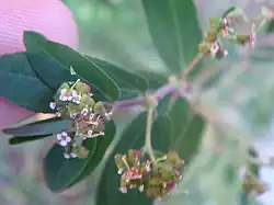The inflorescence may be solitary or borne in clusters. Each inflorescence is a cyathium, with flat white or red appendages surrounding the actual flowers. At the center of the array of appendages are several staminate flowers surrounding one pistillate flower. The latter develops into a fruit, which is a capsule about 2 millimetres (0.079 in) wide.