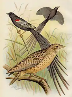 The long-tailed widowbird has three geographically differentiated subspecies. These include delamerei, found in the highlands of Kenya, delacouri, found in the Congo, Angola and Zambia, and progne, found in Botswana, South Africa, Eswatini and Lesotho.[13] Some researchers have suggested the existence of long-tailed widowbird superspecies based on similarity in male nuptial plumage such as tail length,[3] but this is the topic of some debate.[14]