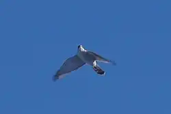 In Europe, the leading prey species numerically (the main prey species in 41% of 32 European studies largely focused on the nesting season) is the 352 g (12.4 oz) rock pigeon (Columba livia).[12] Although the predominance of rock pigeons in urban environments that host goshawks such as the German cities of Hamburg (where they constituted 36% by number and nearly 45% by weight of the local diet) or Cologne is predictable, evidence shows that these development-clinging pigeons are sought out even within ample conserved woodland from Portugal to Georgia.[81][89][90][91] In areas where goshawk restrict their hunting forays to field and forest, they often catch another numerous pigeon, the 490 g (1.08 lb) common wood pigeon (Columba palumbus) (the largest pigeon the goshawk naturally encounters and is known to hunt). The latter species was the main prey in the diet of northern goshawks from in the Germany-Netherlands border area (37.7% of 4125 prey items) and Wales (25.1% by number and 30.5% by biomass of total prey).[21][92][93] It has been theorized that male goshawks in peri-urban regions may be better suited with their higher agility to ambushing feral pigeons in and amongst various manmade structures whereas females may be better suited due to the higher overall speeds to taking out common wood-pigeons, as these typically forage in wood-cloaked but relatively open fields; however males are efficient predators of common wood-pigeons as well.[12][94] Studies have proven that, while hunting feral pigeons, goshawks quite often select the oddly colored pigeons out of flocks as prey, whether the plumage of the flock is predominantly dark or light hued, they disproportionately often select individuals of the other color. This preference is apparently more pronounced in older, experienced goshawks and there is some evidence that the males who select oddly-colored pigeons have higher average productivity during breeding.[95][96]