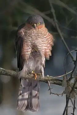The Eurasian sparrowhawk (Accipiter nisus), also known as the northern sparrowhawk or simply the sparrowhawk, is a small bird of prey in the family Accipitridae. Adult male Eurasian sparrowhawks have bluish grey upperparts and orange-barred underparts; females and juveniles are brown above with brown barring below. The female is up to 25% larger than the male – one of the greatest size differences between the sexes in any bird species. Though it is a predator which specialises in catching woodland birds, the Eurasian sparrowhawk can be found in any habitat and often hunts garden birds in towns and cities. Males tend to take smaller birds, including tits, finches and sparrows; females catch primarily thrushes and starlings but are capable of killing birds weighing 500 g (18 oz) or more.