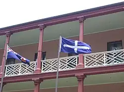 The theory that the Eureka Flag is based on the Australian Federation Flag has precedents in that "borrowing the general flag design of the country one is revolting against can be found in many instances of colonial liberation, including Haiti, Venezuela, Iceland, and Guinea".[47][48] Some resemblance to the modern Flag of Quebec has been noted,[49] that was based on a design used by the French-speaking majority of the colony of the Province of Canada at the time Ross emigrated. Ballarat local historian Father Tom Linane thought women from the St Aliphius chapel on the goldfields might have made the flag. This theory is supported by St Aliphius raising a blue and white ecclesiastical flag featuring a couped cross to signal that mass was about to commence.[50][51] Professor Geoffrey Blainey believed that the white cross on which the stars are arrayed is "really an Irish cross rather than being [a] configuration of the Southern Cross".[52]