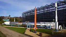 Europa II rocket(larger horizontal rocket in the background. Front center-left is the Skylark sounding rocket, and a model of the Ariane 4 orbital rocket to the right) at Euro Space Center | |