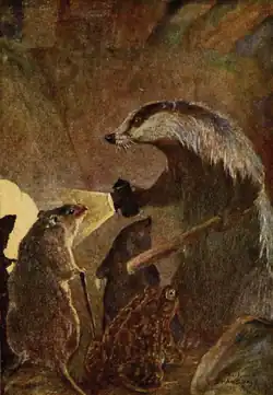 In Kenneth Grahame's The Wind in the Willows, Mr. Badger is depicted as a gruff, solitary figure who "simply hates society", yet is a good friend to Mole and Ratty. As a friend of Toad's now-deceased father, he is often firm and serious with Toad, but at the same time generally patient and well-meaning towards him. He can be seen as a wise hermit, a good leader and gentleman, embodying common sense. He is also brave and a skilled fighter, and helps rid Toad Hall of invaders from the wild wood.[81]