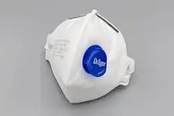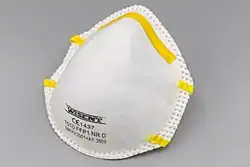 EN 149 defines three classes of such particle half masks, called FFP1, FFP2 and FFP3, according to their filtering efficiency. It also classifies masks into "single shift use only" (not re-usable, marked NR) or "re-usable (more than one shift)" (marked R), while an additional marking letter D indicates that a mask has passed an optional clogging test using dolomite dust. Such mechanical filter respirators protect against the inhalation of particulates such as dust particles, droplets, and aerosols.[3] EN 14683 defines respirators for use in medical settings,[4] while European standard EN 143 defines the 'P' classes of particle filters that can be attached to a face mask, which are P1, P2, and P3. The EN 143 filters are typically used on reusable respirators, like elastomeric respirators.[5]