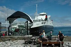 Domestic car ferries on the E39 are regarded as an integral part of national highways. Ferries operate according to a published timetable and standard prices for vehicles and passengers.[1] [2] The E39 includes the following ferry routes from North to South (approximate crossing time in minutes):[2][3]