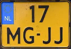 EU format plates are either white or yellow, on a plate wider than it is tall. Yellow registration plates are used both front and rear in Luxembourg and the Netherlands. Denmark and Hungary use yellow plates for vehicles registered as commercial vehicles. Denmark implemented the EU format in 2009, as the last EU country.[8][9] Danish plates have a small holographic strip to the right of the blue EU strip. In Greece, Cyprus, Latvia, Lithuania and Sweden yellow plates are used for taxi vehicles. In Poland yellow plates are used for historic vehicles.
