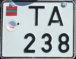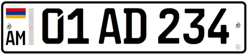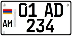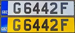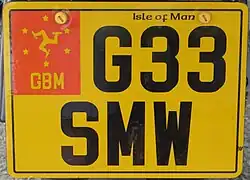 ^The national identifier is optional on British registration plates. Registration plates with the "UK" identifier displayed on its own or with a Union Jack flag satisfy the requirements from the Vienna Convention on Road Traffic, and are valid in countries party to the Convention.[18] The specification of plates incorporating the UK code was created by the British Number Plate Manufacturers Association, and is seen as the default design by the Department for Transport.[28] Registration plates can also feature the national flag of England, Scotland or Wales together with their corresponding code or name (such as "ENG", "Eng" "ENGLAND" or "England"). These are valid within the UK,[29] but a "UK" sticker must be affixed at the rear of the vehicle if driven abroad.[22] Until Brexit, UK registration plates could be issued in the common EU format. This format cannot be issued after the end of the transition period.[30] A "UK" sticker must be affixed at the rear of a vehicle with a registration plate displaying the EU emblem when driven abroad.[22] Note: Many cars also have EU flag on if issued pre-Brexit and cars can have EU flag only with the code "GB"; these plates are not valid for international use, a "UK" sticker must be affixed at the rear of the vehicle if driven abroad.[22]