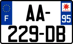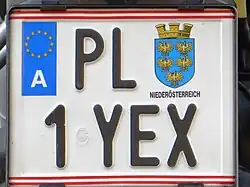 A vehicle registration plate, also known as a number plate (British English), license plate or licence plate (American English and Canadian English respectively), is a metal or plastic plate or plates attached to a motor vehicle or trailer for official identification purposes. The registration identifier is a numeric or alphanumeric code that uniquely identifies the vehicle within the issuing authority's database. In Europe most countries have adopted a format for registration plates that satisfies the requirements in the Vienna Convention on Road Traffic, which states that cross-border vehicles must display a distinguishing code for the country of registration on the rear of the vehicle. This sign may be an oval sticker placed separately from the registration plate, or may be incorporated into the plate. When the distinguishing sign is incorporated into the registration plate, it must also appear on the front plate of the vehicle, and may be supplemented with the flag or emblem of the national state, or the emblem of the regional economic integration organisation to which the country belongs.[1] An example of such format is the common EU format, with the EU flag above the country code issued in EU member states.
