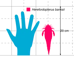 Herefordopterus was a small-sized eurypterid with only 12 cm (5 in) in length, being surpassed in size by other pterygotioids such as Slimonia acuminata with 100 cm (39 in) or Jaekelopterus rhenaniae and (potentially) Erettopterus grandis with 2.5 m (8.2 ft). This size makes it the smallest genus and one of the smallest species of the entire Pterygotioidea superfamily, the related Hughmilleria wangi at 6 cm (3 in) being the smallest one.[1]