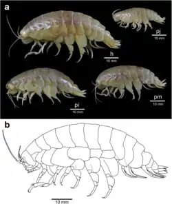 - ^ Weston, Johanna N. J.; Espinosa-Leal, Liliana; Wainwright, Jennifer A.; Stewart, Eva C. D.; González, Carolina E.; Linley, Thomas D.; Reid, William D. K.; Hidalgo, Pamela; Oliva, Marcelo E.; Ulloa, Osvaldo; Wenzhöfer, Frank; Glud, Ronnie N.; Escribano, Rubén; Jamieson, Alan J. (14 May 2021). "Eurythenes atacamensis sp. nov. (Crustacea: Amphipoda) exhibits ontogenetic vertical stratification across abyssal and hadal depths in the Atacama Trench, eastern South Pacific Ocean". Marine Biodiversity. 51 (3): 51. Bibcode:2021MarBd..51...51W. doi:10.1007/s12526-021-01182-z. ISSN 1867-1616. PMC 8120496. PMID 34007343.