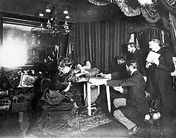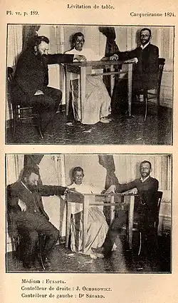 The magician Howard Thurston attended a séance and endorsed Palladino's levitation of a table as genuine.[6] However, at a séance on 18 December in New York, the Harvard psychologist Hugo Münsterberg with the help of a hidden man lying under a table, caught her levitating the table with her foot.[9] He had also observed Palladino free her foot from her shoe and use her toes to move a guitar in the séance cabinet.[4] Münsterberg also claimed that Palladino moved the curtains from a distance in the room by releasing a jet of air from a rubber bulb that she had in her hand.[54][55] Daniel Cohen said that "[Palladino] was undaunted by Munsterberg's exposure. Her tricks had been exposed many times before, yet she had prospered."[56] The exposure was not taken seriously by Palladino's defenders.[57]