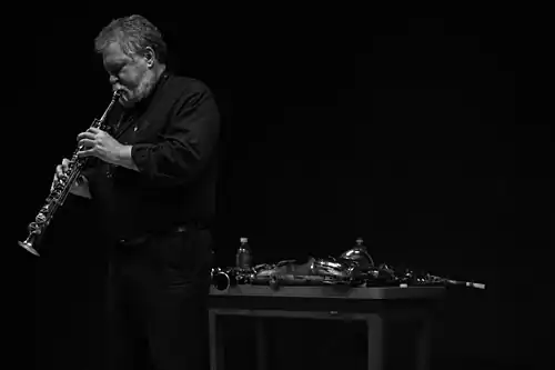 Parker has recorded a large number of albums both solo or as a group leader, and has recorded or performed with Peter Brötzmann,[7] Michael Nyman, John Stevens, Derek Bailey, Keith Rowe, Joe McPhee, Anthony Braxton, Cecil Taylor, John Zorn, Fred Frith, Bill Laswell, Ikue Mori, Thurston Moore, Cyro Baptista, Milford Graves, George E. Lewis, Tim Berne, Mark Dresser, Dave Holland, Sylvie Courvoisier, and many others. Two key associations have been pianist Alexander von Schlippenbach's trio with Parker and drummer Paul Lovens (documented on recordings such as Pakistani Pomade and Elf Bagatellen) and a trio with bassist Barry Guy and drummer Paul Lytton.[8][9] On Parker's 50th birthday, these two bands played a set apiece at a London concert; the results were issued by Leo Records as the 50th Birthday Concert.[10]