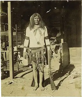 ![]() An Apache Native American holding an Evans repeating rifle, c. 1880 | |
