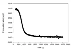 Evapoporometry has the significant advantage of requiring only a lab scale, 2-propanol (or another wetting fluid), and a cell in which to contain the sample and 2-propanol.[1][3] The sample is immersed for some time in 2-propanol prior to measurement to ensure saturation of pores, and is then placed into the cell in an analytical balance and immersed again in 2-propanol, after which the change in mass due to evaporation of the free-standing liquid layer and then draining of liquid from pores is measured by the analytical balance. Instantaneous evaporation rates are calculated from the mass data and input into the above equation to yield a pore-size distribution for the sample. can be used to quantitatively determine value of at which pore draining begins, which is equal to , where is the standard deviation of . This analysis is enabled by the principle that evaporation from small pores will only occur after 2-propanol in larger pores has completely evaporated.[1]