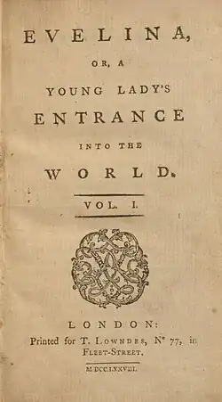 Evelina, or the History of a Young Lady's Entrance into the World is a novel written by English author Frances Burney and first published in 1778. Although published anonymously, its authorship was revealed by the poet George Huddesford in what Burney called a "vile poem".[1]