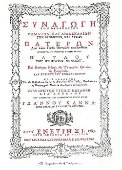 The Evergetinos (Ancient Greek: εὐεργετινός "Of the Benefactress", from Εὐεργέτις evergetis "Benefactress") is a vast collection of materials from a number of other collections of sayings of monastics and others, ranging from the well-known works of St. John Cassian and Palladius, to the anonymously produced Apophthegmata collections, but including materials also from hagiographies, menologia, and other, unspecified and now-lost sources. The collection was compiled in the eleventh century by Hieromonk Paul Evergetinos (i.e., Paul of the monastery of the Benefactress). In the eighteenth century, Macarios of Corinth and Nicodemos the Hagiorite were responsible for putting together a manuscript for publication based upon a number of manuscripts scattered among the libraries of the Holy Mountain. The first printed edition was produced in 1783 and the work has seen many subsequent editions.