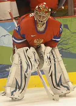 Nabokov next joined Russia for the 2008 IIHF World Championship, arriving after the Sharks were eliminated in the NHL playoffs. He appeared in five games, winning them all, and helped Russia win their first gold medal since 1993, and was named as the tournament's best goaltender and put on the tournament all-star team.[42] The starting goalie for Russia at the 2010 Winter Olympics, Nabokov helped Russia reach the quarterfinals against Canada. However he allowed four goals in the first period and was subsequently pulled, with Russia ultimately losing 7–3.[43] Nabokov finished the Olympics with a record of two wins and one loss as the Russians placed sixth overall.[44] His final appearance in an international tournament was at the 2011 IIHF World Championship. Nabokov played four games for Russia, winning two and losing one, before a groin injury forced him to leave the tournament; Russia finished fourth.[45]