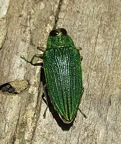 Evides pubiventris is a South African wood-boring jewel beetle species in the family of Buprestidae.[2][3] It has a metallic green coloration that is not reflective in the near-infrared renge of the spectrum.[4] Its host-tree is Lannea discolor.[5]