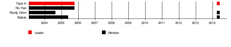 At Unforgiven on September 22, 2002, Triple H defended the World Heavyweight Championship against Rob Van Dam. During the match, Ric Flair, who had been verbally mocked by Triple H in the locker room earlier in the night following his loss to Chris Jericho, came down to the ring and grabbed the sledgehammer from Triple H and teased hitting him before hitting Van Dam instead, allowing Triple H to get the win.[6] From that point on, Flair accompanied Triple H to the ring as his manager. Shortly thereafter, Batista moved from SmackDown! to Raw and Flair also began accompanying him to the ring as a manager and mentor while continuing to second Triple H. On the January 20, 2003 episode of Raw, Randy Orton, who had been out of action due to a shoulder injury, returned and joined Triple H, Flair and Batista in attacking Scott Steiner to complete the group.[7] Two weeks later, the group officially got its name when Triple H, after the group jumped Tommy Dreamer, spoke about how the four men were examples of professional wrestling's evolution from the past (Flair) to the present (himself) to the future (Batista and Orton).[3] During the group's early stages, however, Batista was out of action for nearly eight months due to a triceps tear.[8]