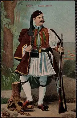 During the remainder of the 19th century, the dress of the separate line battalions of Evzones appears to have differed slightly in detail between units.[33] After a few minor changes over the years, it became the familiar uniform seen worn today by the Presidential Guard. In 1910 a new field service uniform was adopted, substituting a khaki farion cap and khaki doulama jacket for the respectively red and dark blue garments previously worn.[34] The long white woollen hose and turned-up tsarouchia shoes were still retained, although sometimes replaced on campaign by the standard khaki trousers and leather boots of the line infantry.[35] The khaki and off-white field uniform of 1910 was still being worn during the Greek-Italian War of 1940–41, although without the red collar piping and shoulder straps of the earlier uniform. The traditional black fez tassel, and large pompoms on the footwear, were usually removed before battle.[36]