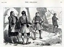 The uniform now associated with the Evzones was not used at the time; but a uniform derived from the traditional costume of the fustanella, had already been adopted by the British-sponsored Greek Light Infantry Regiments raised during the Napoleonic Wars.[4] A similar uniform was adopted when Governor Ioannis Kapodistrias reformed the nascent Hellenic Army in 1828 and formed the so-called "Light Battalions" (Ἐλαφρὰ Τάγματα)—five from Western Continental Greece and eight from Eastern Continental Greece—in an attempt to instill discipline and gradually regularize the irregular groups ("klephts") that had provided the bulk of the Greek forces during the War of Independence. The men of these battalions wore the traditional costume, although they were not designated as Evzones.[5] Following the assassination of Kapodistrias in 1831 and the ensuing political infighting, the Light Battalions effectively disbanded, and their men became armed brigands under the command of the chieftains of the old irregular groups.[6]