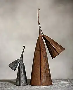 The atoke, gankogui, and axatse sound the rhythmic foundation. The atoke is a high pitched gong played with an iron rod. The Gankogui is a clapperless double bell that is pounded in shape rather than cast. It produces much less audible high partials than western bells ("purer" fundamental) and is played with a stick. It produces two notes each of which vary and must vary among gankogui so they may be used together. The gankogui plays a key pattern, or guide pattern, which the orchestra builds upon, although the tempo is set by the master drummer. Many bell patterns from 8 to 24 pulses are used, but the most common key pattern is the 12-pulse basic Ewe,[10] or standard pattern.[11][12]