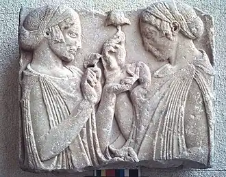 In his 1868 paper, Heuzey argued that the images in the stele suggested the goddesses Persephone (Kore) and Demeter, referring to the cult of Kore and the legend of Demeter found in the Homeric Hymns. French archaeologist and art historian Maxime Collignon explained, "Heuzey believes that this monument refers to the cultus of Core, daughter of Demeter, a divinity suggesting in Greek legend the ephemeral but incessantly recurring bloom of nature."[9] French archaeologist Olivier Rayet (1847–1887) disagreed with the interpretation Heuzy offered.[4] While Heuzey's perspective still has adherents, it has largely fallen out of favor among art historians. According to the Perseus Project at Tufts University, "It is now generally agreed ... that the figures represented are mortals rather than goddesses."[7]