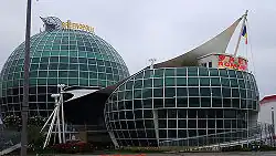 The overall budget for the Canadian pavilion was 45 million Canadian dollars (US$43.57 million).[30] Cirque du Soleil designed the concept for the pavilion[29] and also created public performances, organized cultural programs[29] and developed strategic corporate alliances for the pavilion. The exterior of the pavilion was covered in polished steel and cedar.[29] The pavilion was anchored by an open public square and surrounded by three large, wooden, curved structures.[28] The square was a performing area, with performances by Cirque du Soleil.[28] Part of the pavilion's exterior walls were covered by a special kind of greenery and rainwater was collected by a drainage system for use inside the pavilion.