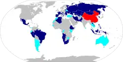 China maintains extradition treaties with 59 nations/jurisdictions while 39 of them are ratified.[3][4] According to the official website of the People's Procuratorate of Guangdong Province, by January 2023, the countries below have signed extradition treaties with People's Republic of China:[3]