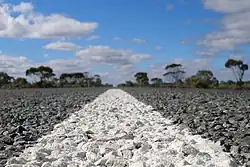 Eyre Highway is the only sealed road linking the states of Western Australia and South Australia.[2] It is one of Western Australia's two sealed interstate roads, the other being the Victoria Highway linking Western Australia and Northern Territory. Eyre Highway runs east from Norseman in Western Australia for 1,200 kilometres (750 mi) across the Nullarbor Plain to Ceduna, South Australia. It crosses the top of the Eyre Peninsula as it continues eastwards for 470 kilometres (290 mi), before reaching Port Augusta.[3]