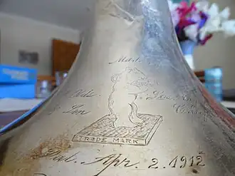Reginald Birdsall (R.B.) Olds (b. September 11, 1899) came to work with his father in 1920, having served in the U.S. Navy during World War I. With R.B.'s enthusiasm, Olds published their first catalogue in 1925 and introduced new models shortly after. It was about 1924 that Olds started making mouthpieces with ivory rim and cup and the trademark "Golden Bear" playing the trombone was first engraved on the bells. R.B. was most likely responsible for using the slogan: "It's a Bear", and otherwise modernizing the image of the company and its products. Also, during these years, they were working on trumpet design, finally tooling up for its production by 1928.