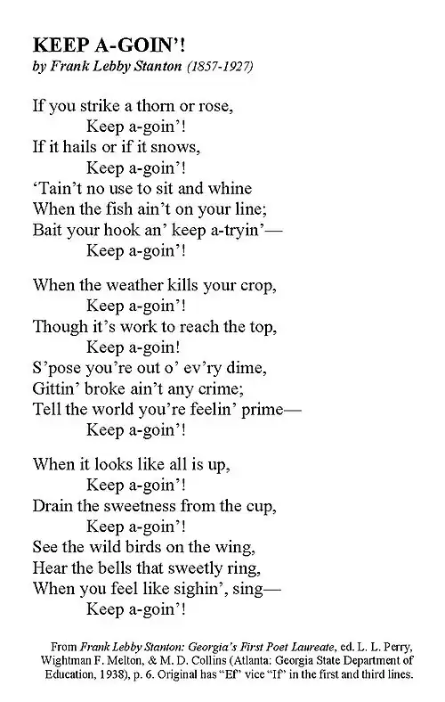 - ^ Biographical information with Stanton's "Keep a-Goin'" poem. For further information see Bookrags.com essay on Stanton (requires fee).