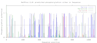 A SAPS analysis of this protein was performed against the swp23s.q database, which indicated the presence of an abnormally large number of serine amino acids and an abnormally small number of alanine amino acids in this protein.[17] According to a review article by Fayard et al., phosphoinositide-dependent kinase 2 (PDK2) is a serine/threonine kinase that is important for regulating cell cycle. Because the FAM214A protein has a larger number of serine groups than is considered normal, there is the possibility that PDK2 has an important effect on this protein.[26] In order to determine whether the excessive number of serines were actually predicted to be phosphorylated, the protein sequence was run through the program NetPhos from the ExPASy webserver.[23] This program predicted the phosphorylation of 69 serines, 14 threonines, and 9 tyrosines.[23] According to the SAPS analysis from above, there are a total or 134 serines, thus indicating that approximately half are predicted to be phosphorylated in vivo. A diagram of the phosphorylation predictions is shown to the right.