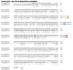 Orthologs: FAM227B is present in Deuterostomia and Protostomia, dating as far back as porifera. FAM227B is not present in choanoflagellates, and gene alignment sequences have shown that FAM227B is a rapidly evolving gene due to its evolution trajectory compared to cytochrome c and fibrinogen alpha.[19]