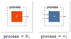 process = + : abs; Here is an example of parallel composition using the , operator that arranges its left and right expressions in parallel. This is analogous to a stereo cable.
