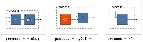 process = *(0.5); The recursive composition operator ~ can be used to create block diagrams with cycles (that include an implicit one-sample delay). Here is an example of an integrator that takes an input signal X and computes an output signal Y such that Y(t) = X(t) + Y(t−1):