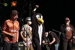 St. Pauli is also a worldwide symbol for punk and related subcultures.[46] The skull and crossbones logo and the team's brown and white football jerseys have often been worn by international artists such as the bands Asian Dub Foundation, Gaslight Anthem, Panteon Rococo and Molotov (band). The KMFDM frontman and Hamburg native Sascha Konietzko is a recognisable St. Pauli fan at one point placing a huge picture of a fist smashing a swastika on his band's main page, with the caption "St. Pauli Fans gegen Rechts!" ("St. Pauli fans against the Right") underneath it. American punk band Anti-Flag can be seen wearing St. Pauli shirts in numerous music videos for their album American Fall. Another notable supporter and sponsor is Andrew Eldritch, lead singer of band The Sisters of Mercy. On his 2006 "Sisters Bite The Silver Bullet"- tour, Eldritch wore the famous skull and crossbones shirt. Georg Holm, the bassist of the Icelandic post rock band Sigur Rós, has performed at several festivals wearing a St. Pauli shirt. Alex Rosamilia, the guitarist for The Gaslight Anthem, frequently wears a St. Pauli hat and hoodie and displays a flag of the club's logo in front of the speakers of his guitar amp. Editors guitarist and synthesiser player Chris Urbanowicz frequently wears the skull and crossbones t-shirt. Dave Doughman, the singer for Dayton, Ohio's Swearing at Motorists, who has been spotted in concert with the skull and crossbones on his guitar and amplifier, moved to St. Pauli in 2010. Bad Religion played a charity match against St. Pauli's third team in 2000.[47] German musicians who are fans include: Fettes Brot, Die Ärzte singer/drummer/songwriter Bela B., Kettcar, Tomte, and many other bands, most of them underground.