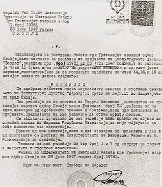 After World War Two, FK Vardar was established with the merger of city rivals FK Pobeda (1919) and FK Makedonija (1922), in the hall of cinema "Vardar" on 22 July 1947.[1] The foundation assembly had decided the club's color to be blue and it was, but already at the next assembly the decision was changed to red and white. FK Pobeda has competed in District League and Subdivision League till 1941. They played in the first season of the Federal League after the World War II, finished at the eighth place and won the relegation playoffs against FK Sloga from Novi Sad, FK Vardar was a member of the Federal league from the very beginning. However, during the following decade they were several times relegated and promoted back again.