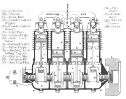 The FN Four's engine was designed by Paul Kelecom, who had designed single-cylinder engines prior to the FN.[16] The air-cooled longitudinal layout was prone to overheating the rear cylinders, a trait overcome in later designs with water cooling and transverse layout.[17]