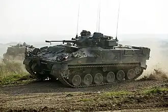 The Warrior incorporates several design features in keeping with the UK's battlefield experience. In particular, there are no firing ports in the hull, in line with British thinking that the role of the armoured personnel carrier/infantry fighting vehicle (APC/IFV) is to carry troops under protection to the objective and then give firepower support when they have disembarked. The absence of firing ports also allows appliqué armour to be fitted to the sides of the vehicle, which is invariably applied to Warriors on operations. The cage armour used at one stage was replaced in 2007 by "Wrap Two" appliqué armour.[9] The basic armour provides all-around protection against small arms ball ammunition.