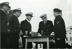 On 13 October 1921, he became head of the Royal Swedish Naval Academy, a position he held until 1925. He was promoted to commander on 16 February 1923 and became head of a department in the Naval Staff from 1926 to 1929. Promoted to captain on 11 February 1927, he formally assumed the position on 1 June 1928. He was a member of the defence inquiry in 1928 and 1929, and served as flag captain in the Commander-in-Chief of the Coastal Fleet's staff from 1930 to 1931. On 15 April 1931, he was appointed head of the Military Office of the Naval Defence (Sjöförsvarets kommandoexpedition). In 1932, he served as an expert at the World Disarmament Conference in Geneva. Promoted to rear admiral on 27 January 1933, he officially assumed the role in the navy on 15 April 1933 and, that same year, became Commander-in-Chief of the Coastal Fleet.[1] Tamm was appointed Chief of the Navy and promoted to vice admiral on 20 January 1939 and succeeded Vice Admiral Charles de Champs on 1 April the same year with an appointment until 31 March 1945.[4] He was appointed admiral in the reserve in 1947, two years after he left active service.