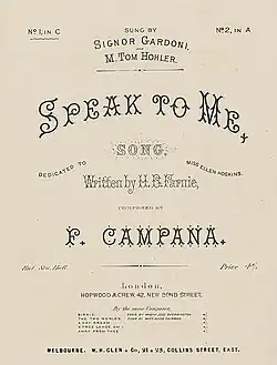 Campana composed at least two patriotic songs during the 1848–1849 Italian revolutions. One was set to Arcangelo Berettoni's poem "La costituente italiana" (The Italian Constituent).[13] The other, "Inno nazionale" (National Hymn) set to a text by Franco Carrai, became the most frequently sung song in Livorno at the time.[14] He also composed a chorus to accompany a dramatic allegory performed at the Teatro degli Avvalorati in 1847 to celebrate Leopold II, Grand Duke of Tuscany granting Livorno its own Civil Guard.[15] Between 1846 and 1854, Francesco Lucca, the firm which had commissioned Verdi's early opera Il corsaro,[16] published seven collections of Campana's songs. Ricordi was to publish another nineteen between 1851 and 1873. The Ricordi collections were variously entitled Souvenirs, Pensieri, Echi, Sospiri, or Ricordi (Souvenirs, Thoughts, Echoes, Sighs, Memories), with each one devoted to a different place which had a personal significance in Campana's life, including Naples, Venice, Rome, Paris, Bagni di Lucca, and Lake Como.[2] The majority of Campana's songs were set to Italian texts, some written by the composer himself such as "Quando da te lontano!" (When I Am Far From You!). However, he also set texts by English writers which became popular both as concert pieces and as parlor songs. His most well-known collaborators in this genre were Henry Brougham Farnie (e.g. "Speak to Me" and "The Scout: A Trooper's Ditty") and Henry Hersee (e.g. "A Free Lance Am I: Or the Soldier of Fortune" and "The Little Gipsy").[17] Another popular concert piece in England was Campana's "Voga, voga, O marinaro" (Row, Row, O Sailor), a barcarole for three female voices. It was later mentioned in Eleanor Farjeon's 1941 novel, Miss Gransby's Secret, a satire on the sensibilities of the Victorian era.[18]