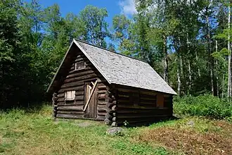 The Fabyan Guard Station is located about 0.7 miles (1.1 km) north of United States Route 302, on Cherry Mountain Road near a crossing of Desolation Brook. It stands in a small clearing on the west side of the road. It is a single-story log structure, measuring about 16 by 20 feet (4.9 m × 6.1 m), with a gabled roof. It is built out of spruce logs, with the gaps filled with wooden slats and chinked with oakum. The main facade has a door on the right, fashioned out of vertical boards, and windows to its left and in the gable above. The side walls each have two small windows.[2]