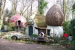 Dwarf Village was originally designed by Anton Pieck with later contributions by Ton van de Ven. In 1952, the village consisted of three large toadstools, through which children could walk, with miniature adornments, such as little chairs and dwarf laundry hanging from a wire. Later additions included a large inhabited dwarf house in 1972, and a hollow tree with a dwarf playing a clavichord in 1974. The village was completed by a toadstool with a writing dwarf and a house with a waterwheel belonging to a dwarf-couple in 1980. During the 1980s, the male dwarf received spoken lines.