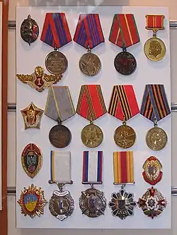 In terms of objects, these include award items such as medals and their accessories, ribbon bars, badges, pins, award certificate documentation, etc., and phaleristics may also designate the field of collecting related items.[1] Although established as a scientific sub-discipline of history, phaleristics usually studies orders and decorations "detached from their bodies".[2]