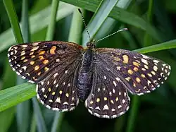 Melitaea diamina has a wingspan of 36–42 mm. Females are larger than males.[5][6] This medium-sized species is highly variable in extent of black markings and in the diversification of ground colour on the upperside of the wings. The upper side of the wings usually is black brown, with yellowish-orange ground colour and white chequered fringe. On the upperside of the hindwings there are very heavy dark markings. Sometimes it may be uniformly dark brown. The underside of the hindwings shows a submarginal series of white half moons and a few bands of creamy-white and orange checkers.[4][7]