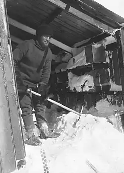 Although supplies had been left in Aladdin's Cave—including fresh fruit—there were not the spare crampons he had expected. Without them he could not hope to descend the steep ice slope to the hut, and so he began to fashion his own, collecting nails from every available source and hammering them into wood from spare packing cases.[83][84] Even when completed, a blizzard confined him to the cave, and only on 8 February was he able to begin the descent. Nearing the hut, he was spotted by three men working outside, who rushed up the hill to meet him.[85]