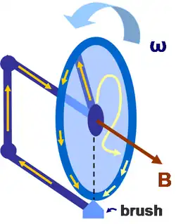 Careful thought showed that, if the magnetic field was assumed to rotate with the magnet and the magnet rotated with the disk, a current should still be produced, not by EMF in the disk (there is no relative motion between the disk and the magnet) but in the external circuit linking the brushes,[10] which is in fact in relative motion with respect to the rotating magnet. (The brushes are in the laboratory frame.)