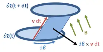 This is the most difficult part of the proof; more details and alternate approaches can be found in references.[5][6][7] As the loop moves and/or deforms, it sweeps out a surface (see figure on right). The magnetic flux through this swept-out surface corresponds to the magnetic flux that is either entering or exiting the loop, and therefore this is the magnetic flux that contributes to the time-derivative. (This step implicitly uses Gauss's law for magnetism: Since the flux lines have no beginning or end, they can only get into the loop by getting cut through by the wire.) As a small part of the loop moves with velocity v for a short time , it sweeps out a vector area vector . Therefore, the change in magnetic flux through the loop here is